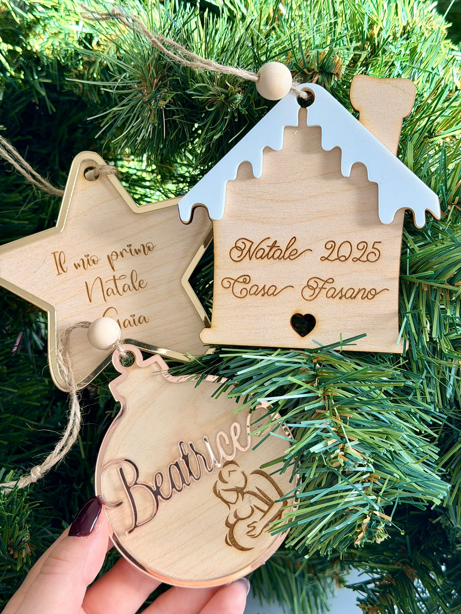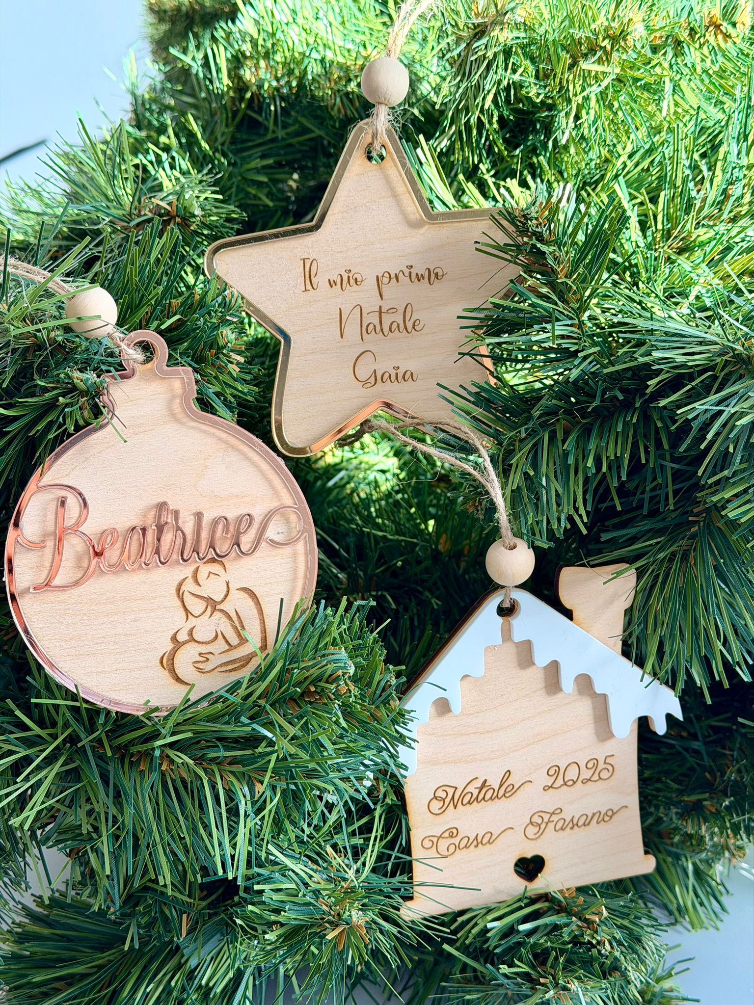 Specificare NELLE NOTE DOPO L’ACQUISTO : nome per appendino pallina, frase per appendino casetta e stella.