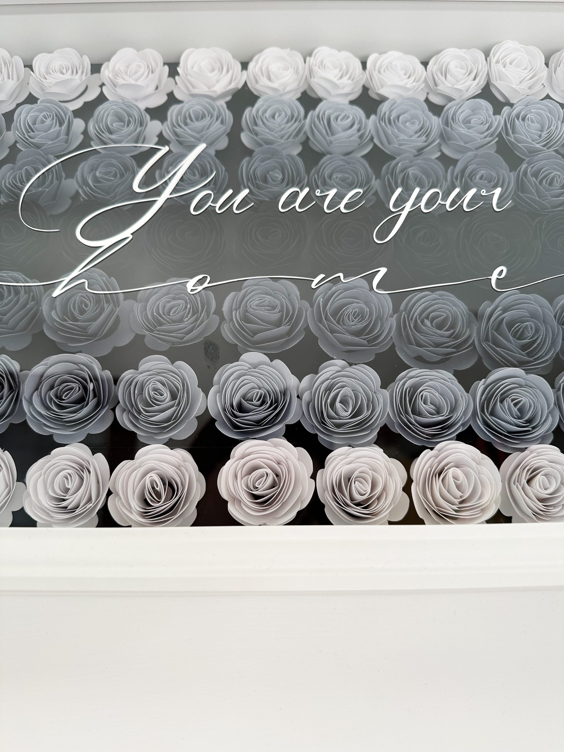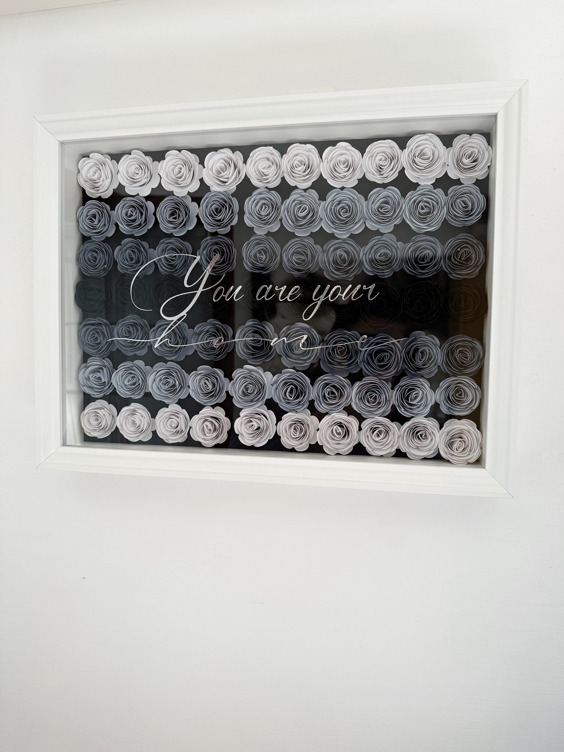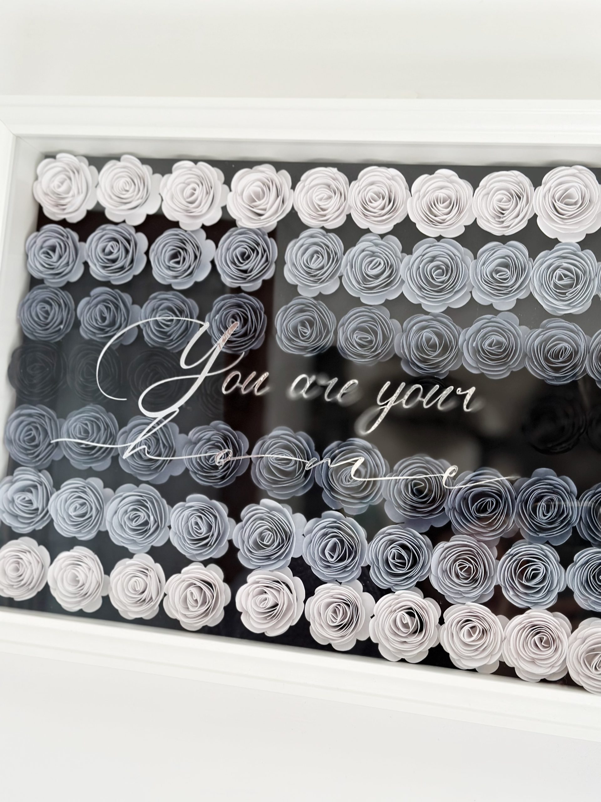 Cornice con 70 fiori fatti a mano e frase personalizzata.