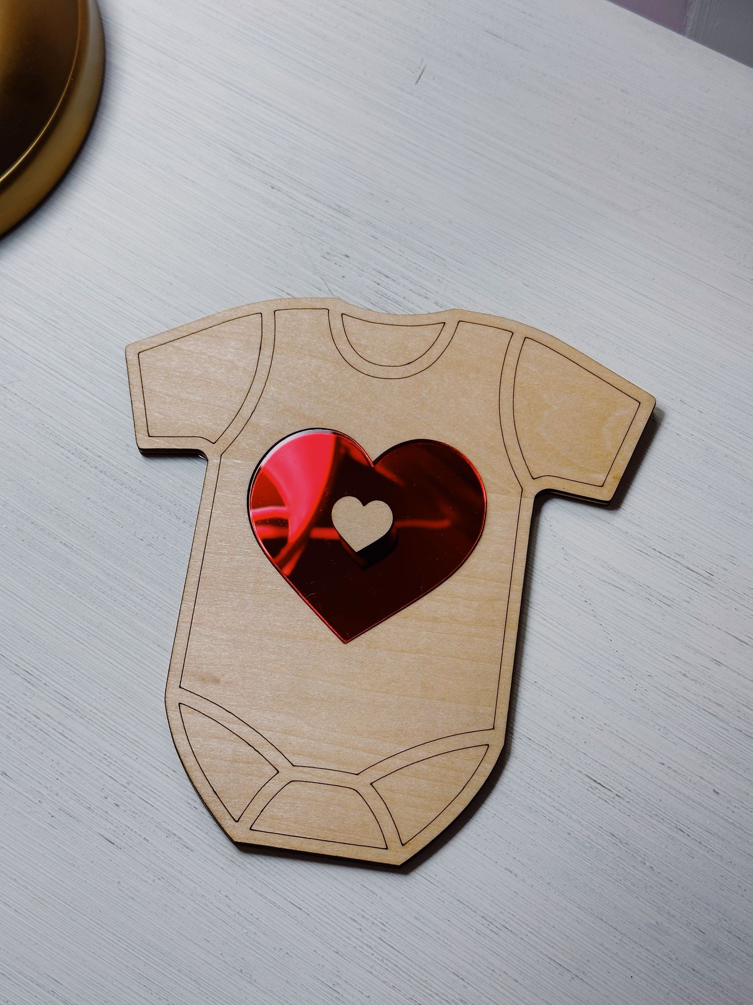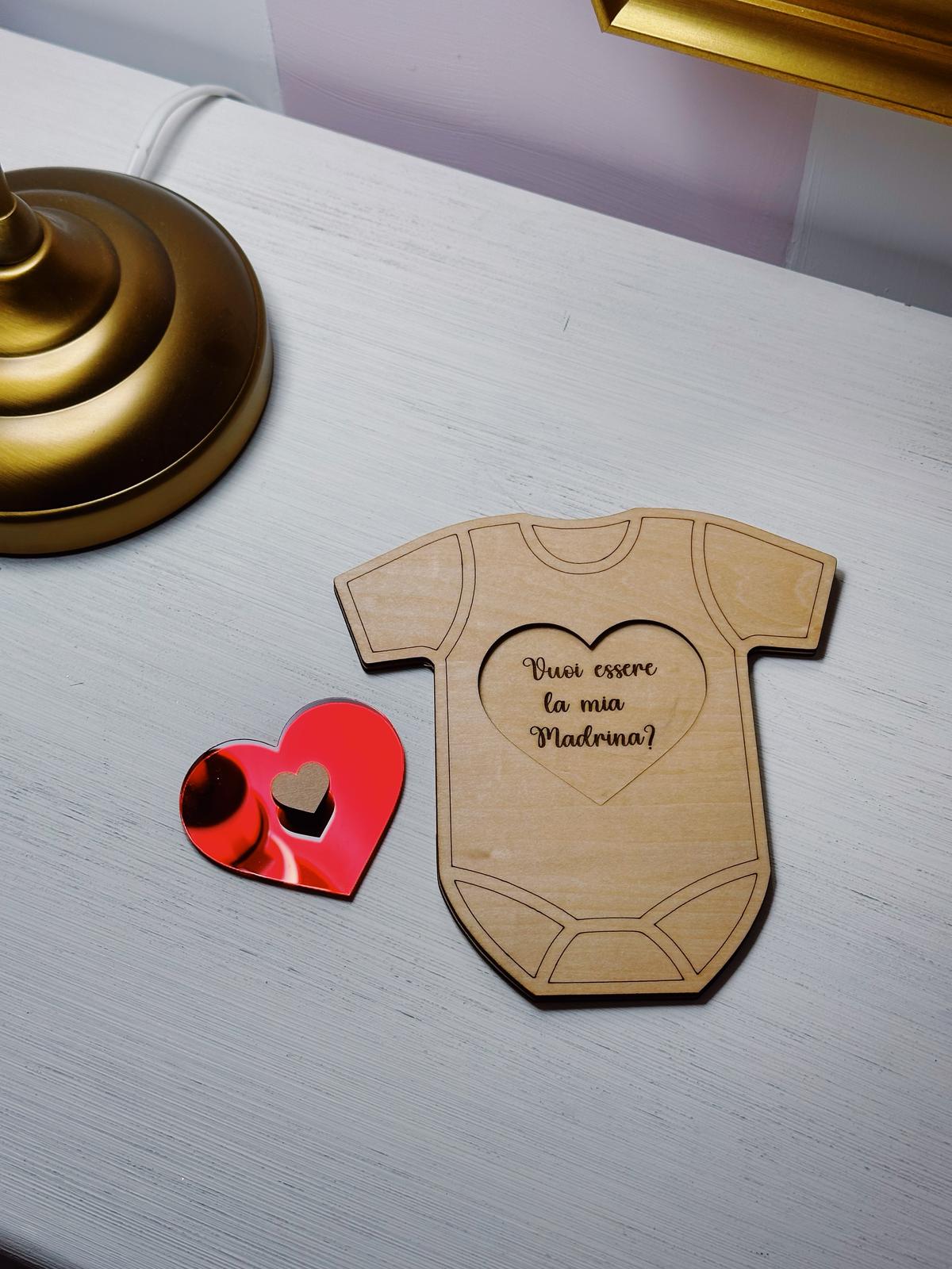 Body in legno con cuore in plexiglass, con frase personalizzabile all’interno. Altezza body 15 cm, bello da esporre in casa. E’ possibile scrivere la frase da personalizzare nelle note dopo aver fatto l’ordine.