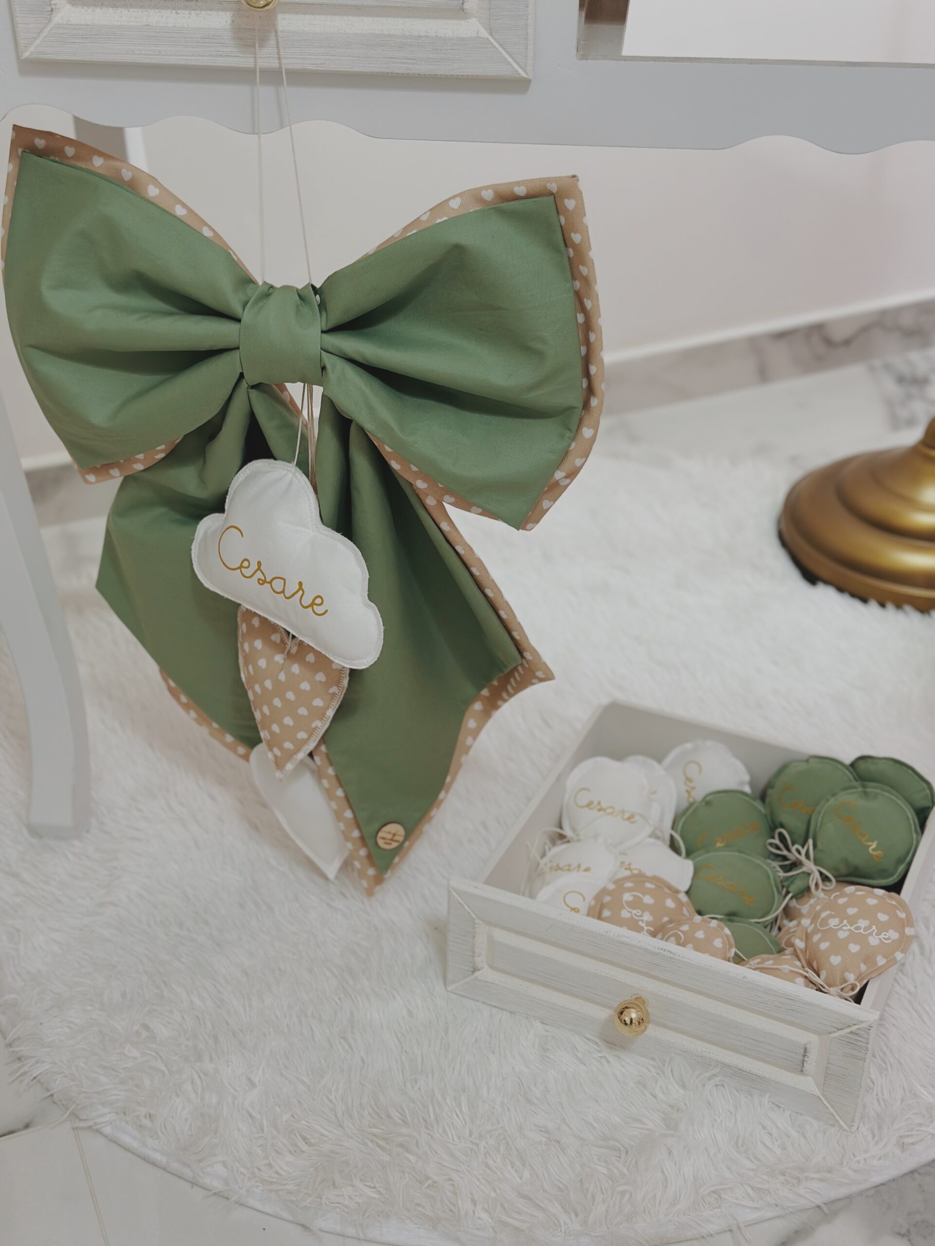 Fiocco nascita (altezza circa 55 cm) composto da due fiocchi, uno a fantasia, uno tinta unita. Possiede quattro pendenti di cui tre cuoricini e una nuvoletta con nome. E’ possibile scegliere colori e fantasie. Al momento dell’ordine scrivere su whatsapp al 3890280228 per le personalizzazioni.