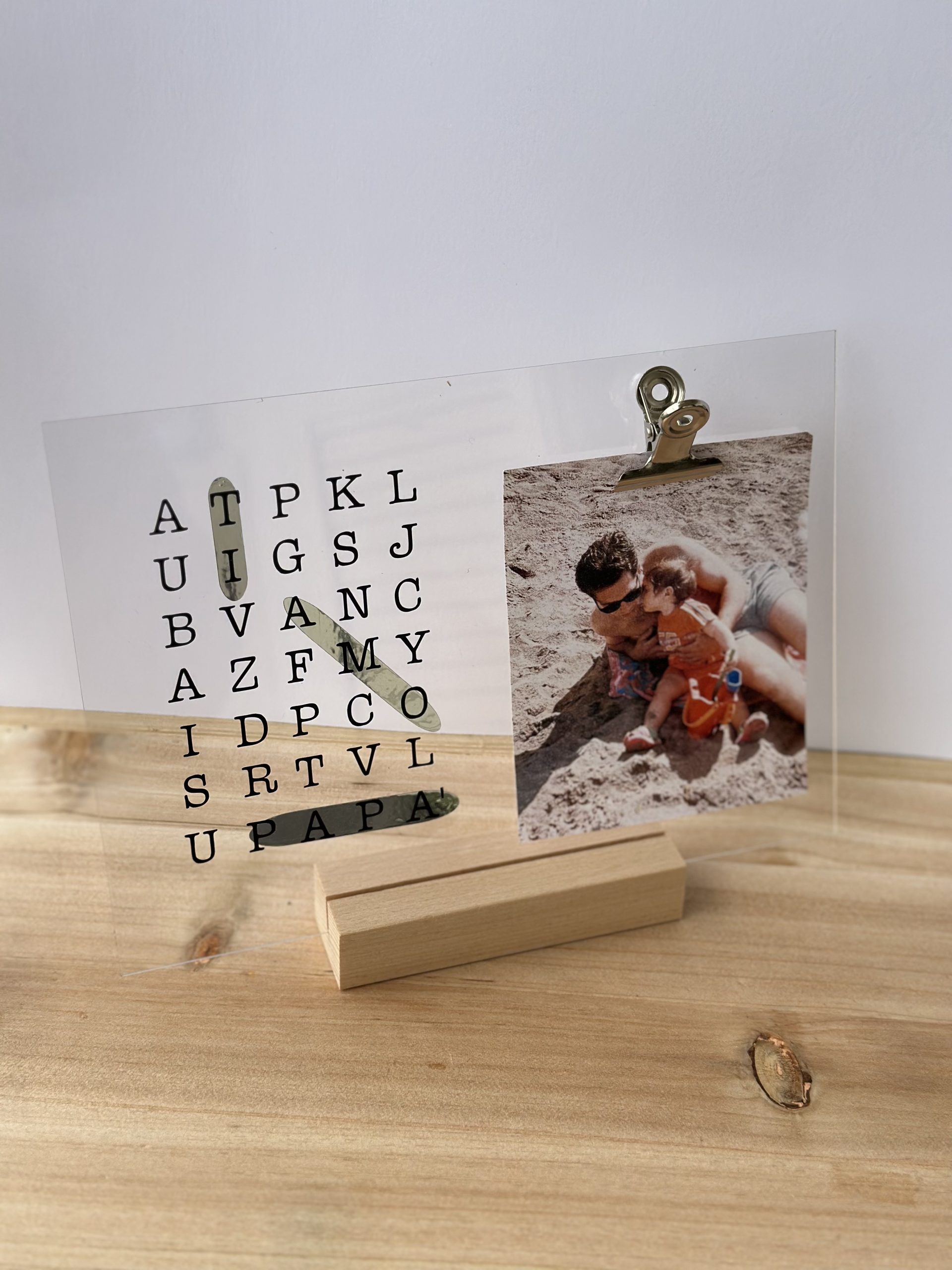Lastra plexiglass misura 13×18 cm con crucipuzzle e foto personalizzata, compresa di supporto in legno.