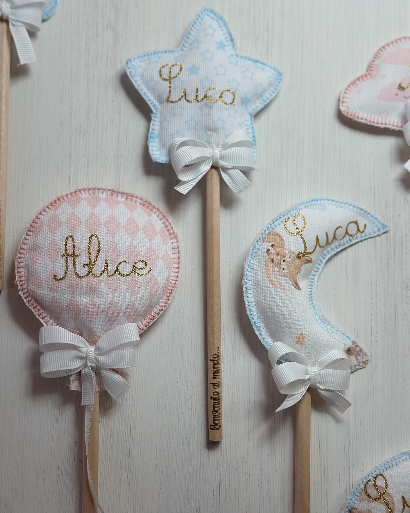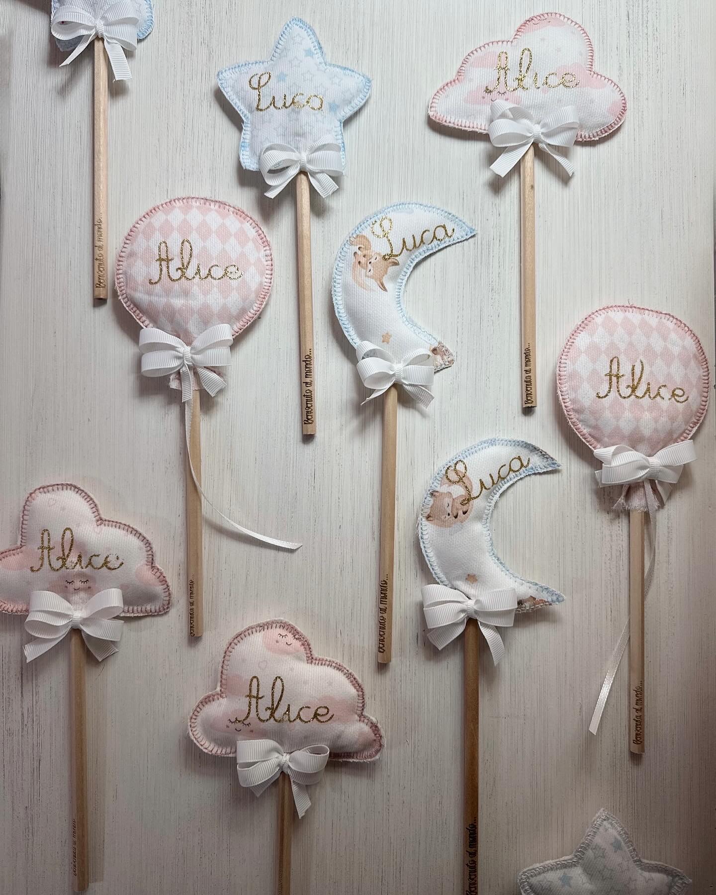 Matita personalizzata con forma fatta a mano. La matita presenta una frase incisa che può essere cambiata, la forma alla punta a scelta tra le quattro e possibilità di scelta stoffe, nome e colori. Ideale come bomboniera, possibilità di aggiungere confetti.