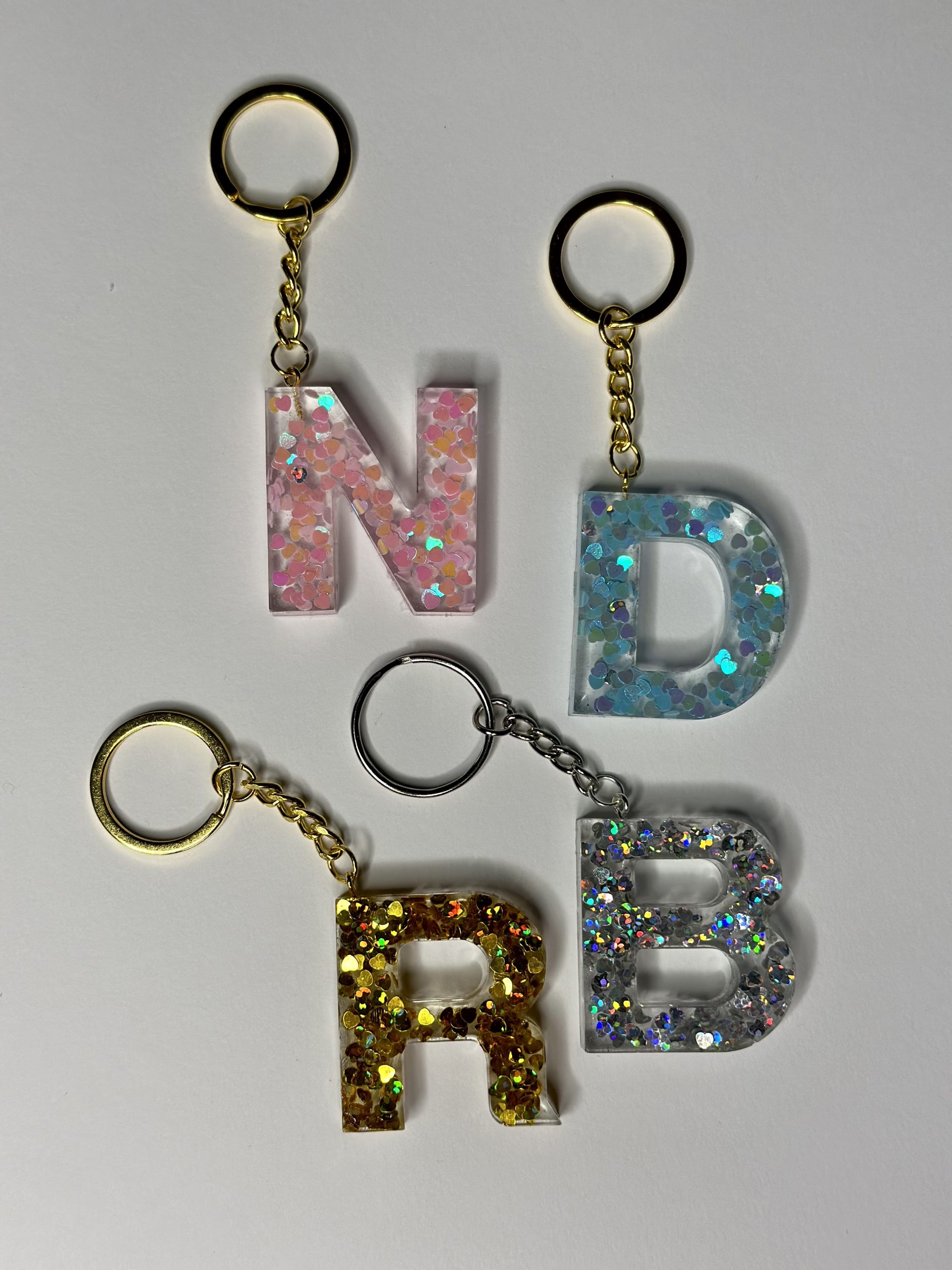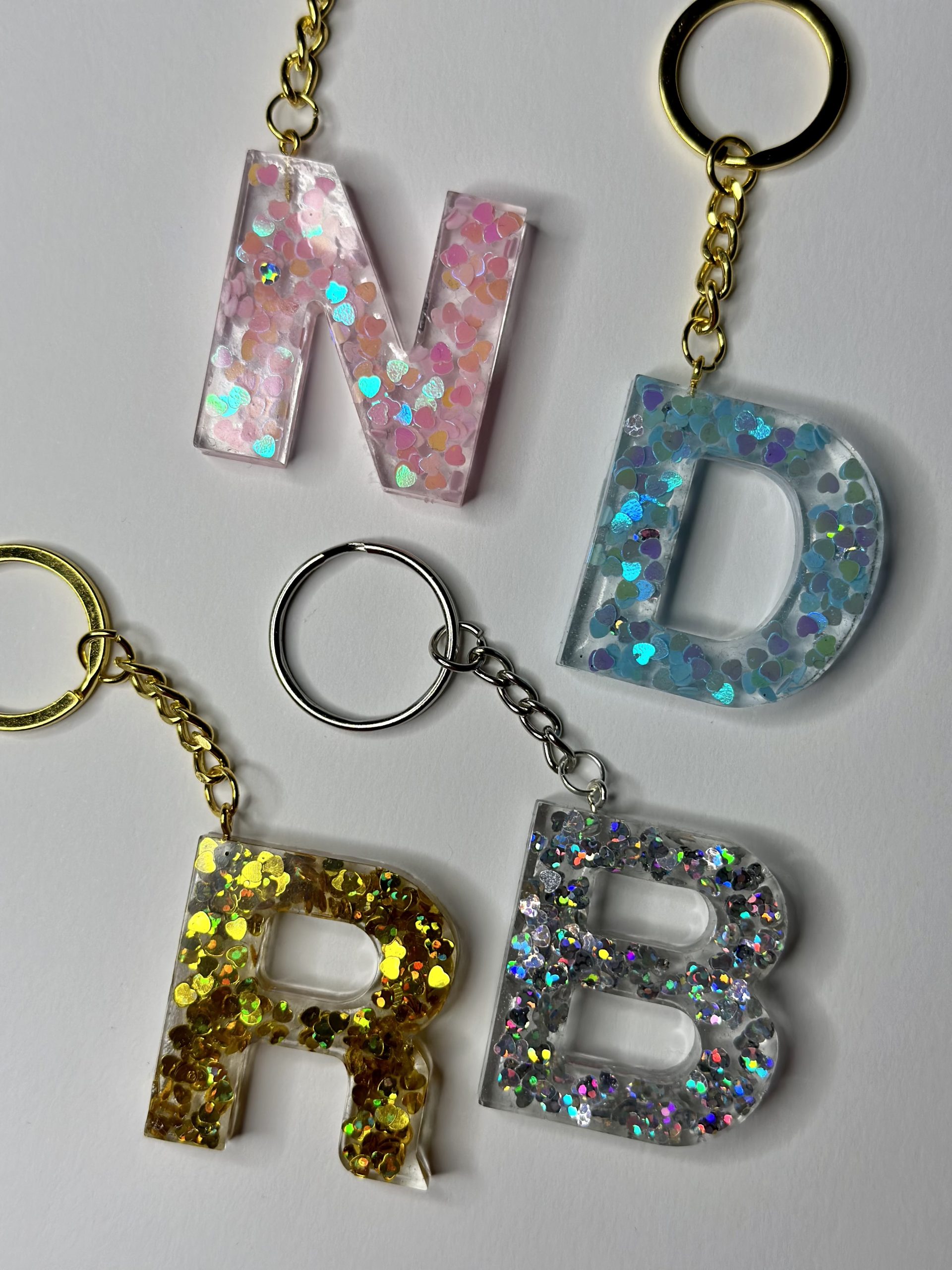 Portachiavi in resina fatto a mano con cuoricini iridescenti. Quattro colorazioni disponibili, oro, argento, celeste e rosa. La lettera misura circa 5 cm di altezza, ideale come bomboniera o segnaposto.