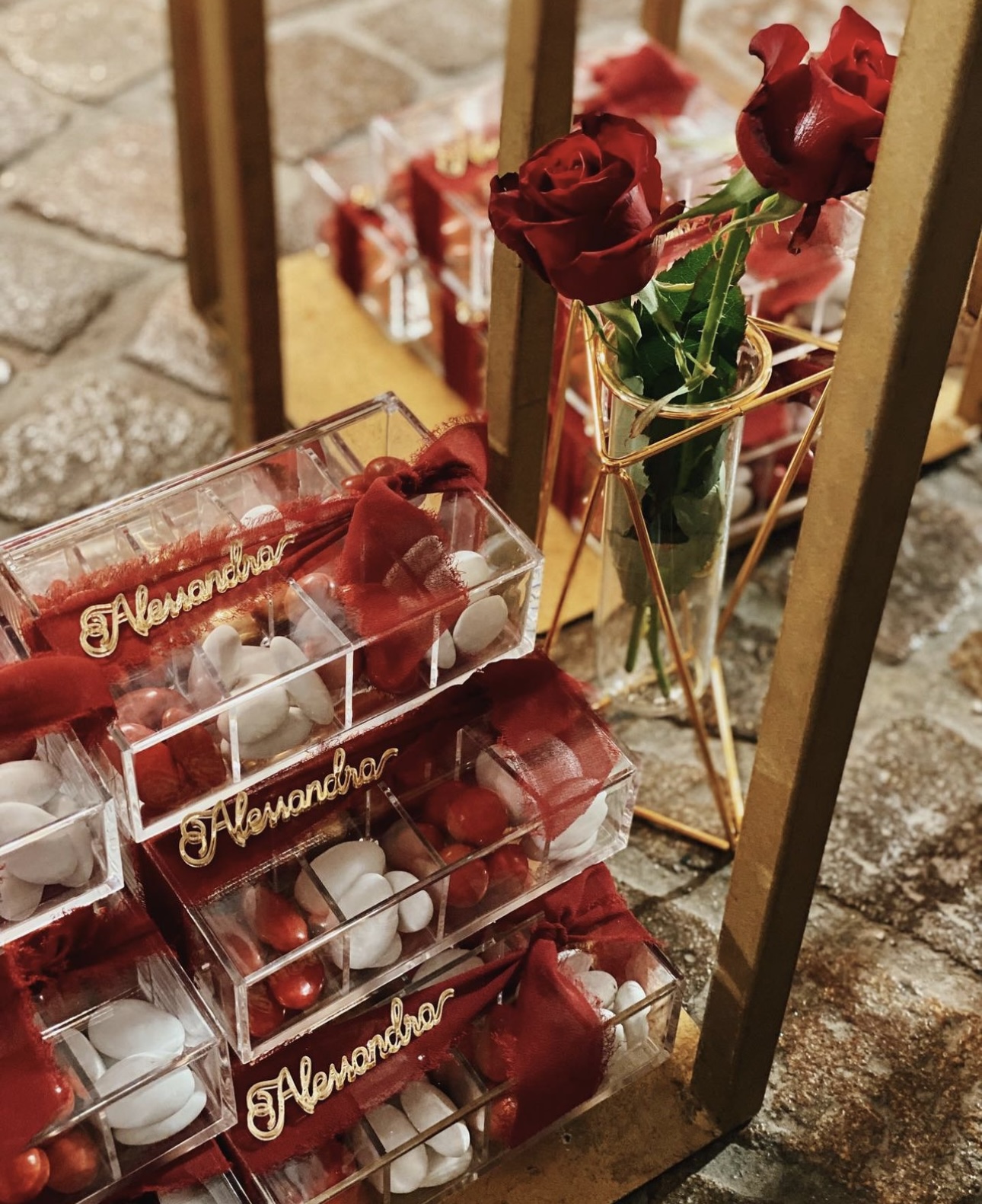 Scatola in plexiglass misura 10×16 cm. Presenta otto scomparti dove inseriremo i confetti, selezionati in base a colore e tema scelto. Insieme al fiocco, il nome in plexiglass del/la festeggiato/a a completare quest’elegantissima bomboniera.